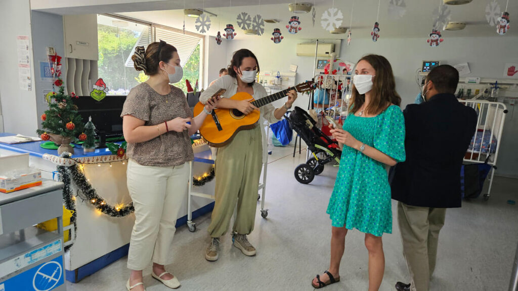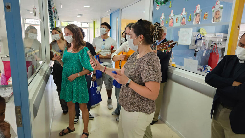 Para finalizar la jornada, el coro se trasladó a las salas de hospitalización para visitar a los niños y niñas. Entre cánticos y sonrisas, la música llevó un momento de alivio y compañía directamente a las camas de nuestros pacientes, integrándolos plenamente en esta celebración navideña.
